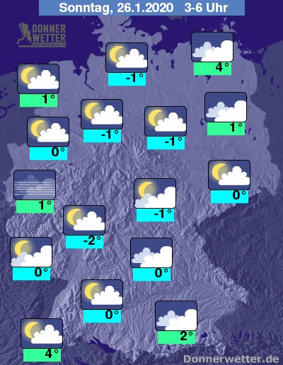 In der Nacht zum Sonntag ist es teils wechselnd bis aufgelockert, oft aber auch stark bewölkt. Es bleibt trocken, jedoch bildet sich stellenweise Nebel oder Hochnebel. Die Temperatur sinkt auf 4 Grad in Stralsund und Freiburg und bis auf -2 Grad am Westerwald.