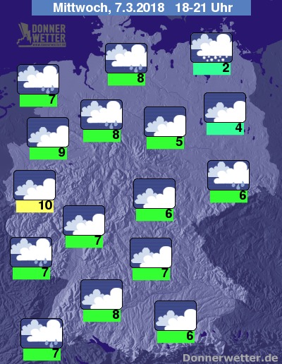 Am Donnerstag halten sich im Norden anfangs dichte Wolken und es fällt hier und da noch Regen, sonst ist es über der Nordhälfte bereits verbreitet heiter und trocken. Im Süden ist es heiter bis aufgelockert bewölkt und zunächst trocken, gegen Abend ist im Südwesten erster Regen möglich. Die Temperatur steigt auf 4 bis 11 Grad.