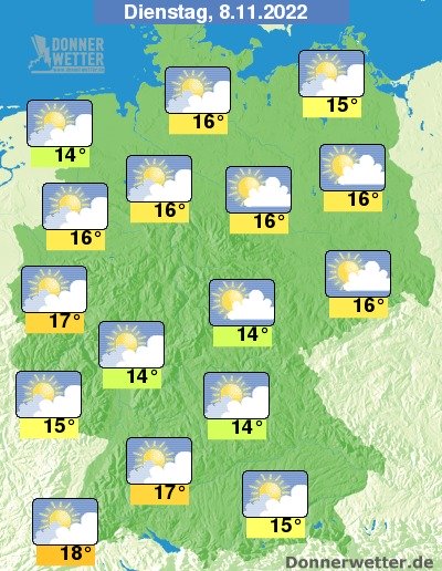 Am Dienstag ist es teilweise trüb oder stark bewölkt, teils zeigen sich auch Aufheiterungen, dabei bleibt es trocken. Die Temperatur erreicht 14 Grad im Eichsfeld und bis 18 Grad im Breisgau. An der Nordsee ist es verbreitet stürmisch.