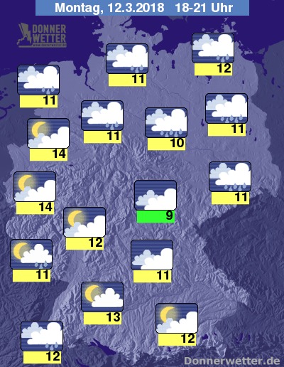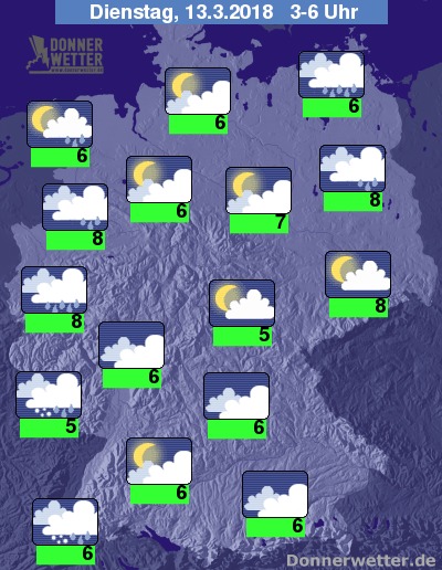 In der Nacht zum Dienstag verlagern sich die Niederschläge im Osten und Norden immer weiter auf den Nordosten Deutschlands. Über der Südwesthälfte des Landes ist es zunächst meist leicht bis aufgelockert bewölkt und trocken. Im Nachtverlauf ziehen in den westlichen Landesteilen jedoch dichte Wolken mit Regen oder Graupel auf. Die Temperatur sinkt auf 8 bis 5 Grad.