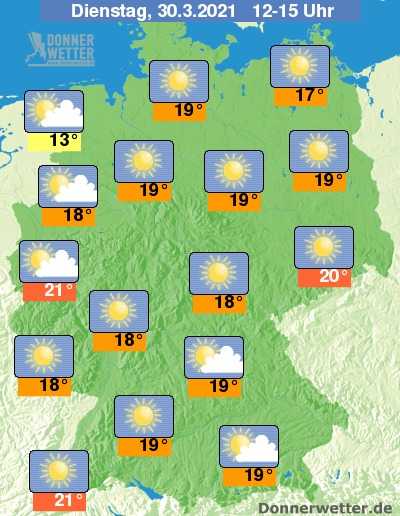 Heute Nachmittag ist es verbreitet sonnig, hier und da ziehen nur lockere Wolken durch. Es bleibt trocken bei Werten von 13 Grad in Cuxhaven und bis 21 Grad in Freiburg.