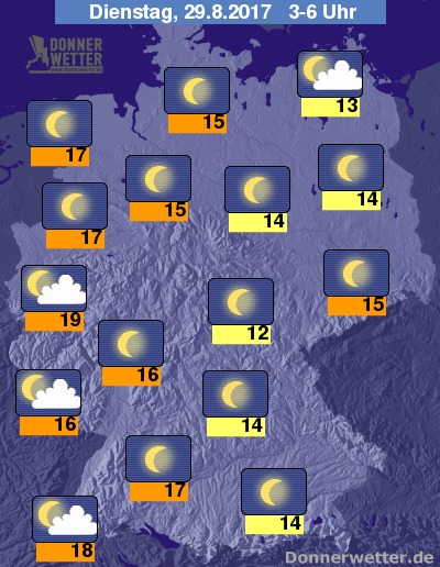 In der folgenden Nacht zeigt sich der Himmel über Deutschland weitgehend sternenklar, hier und da ziehen auch mal lockere Wolkenfelder übers Land hinweg, dabei bleibt es trocken. Die Temperatur sinkt auf 19 Grad in der Kölner Bucht und bis etwa 12 Grad im Eichsfeld.
