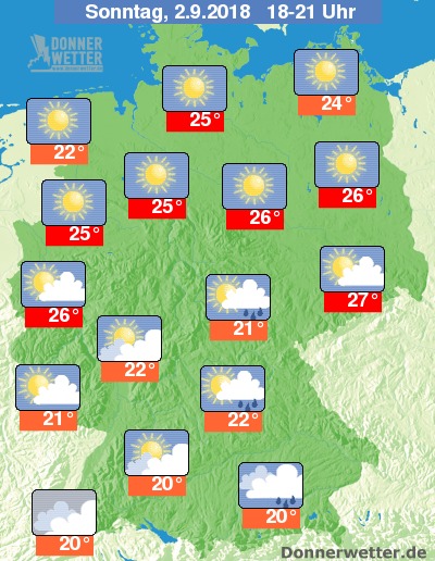 Heute Abend herrscht über der Nordhälfte Deutschlands überwiegend sonniges und trockenes Sommerwetter, hier ziehen nur örtlich lockere Wolkenfelder durch, dabei bleibt es trocken. Weiter nach Süden hin ist es dagegen teils aufgelockert, teils auch noch stark bewölkt, dazu fällt hier gebietsweise Regen. Die Temperatur liegt bei 20 Grad in Augsburg und bis 27 Grad in Dresden.