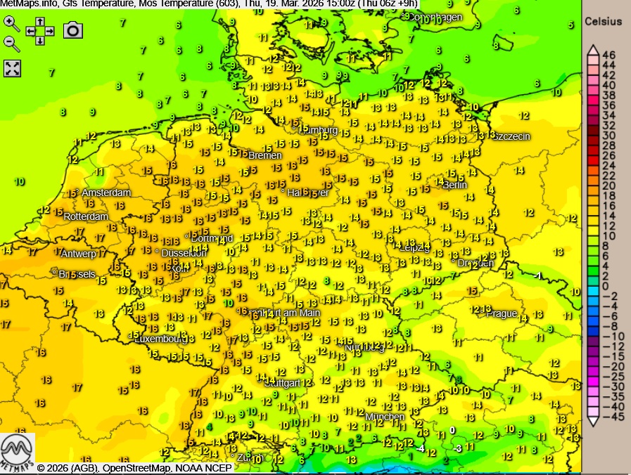 Die Temperatur- und Wetterkarte für Donnerstagnachmittag (15:00 Uhr) nach GFS: