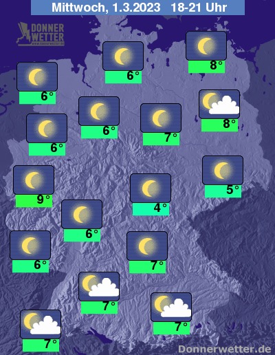 Heute Abend ist der Himmel verbreitet sternenklar, lockere Wolken sind nur selten, am ehesten im Alpenvorland möglich. Die Temperatur liegt bei 4 Grad in Erfurt und bis 9 Grad in Köln.
