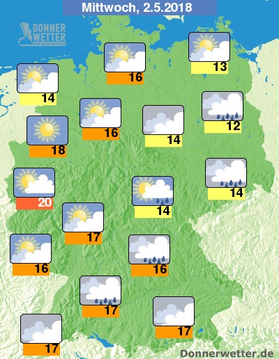 Am Mittwoch scheint zunächst die Sonne. Am Nachmittag können sich örtliche Schauer- und Gewitterwolken zusammen brauen. Die Höchsttemperaturen liegen bei 24 bis 28 Grad.