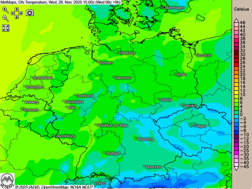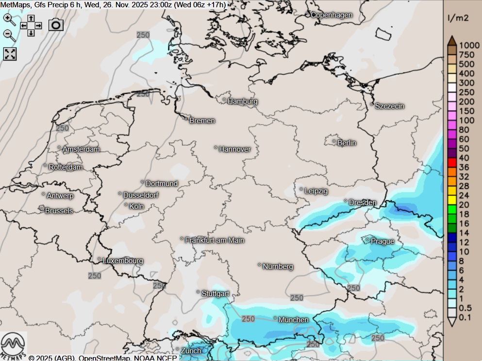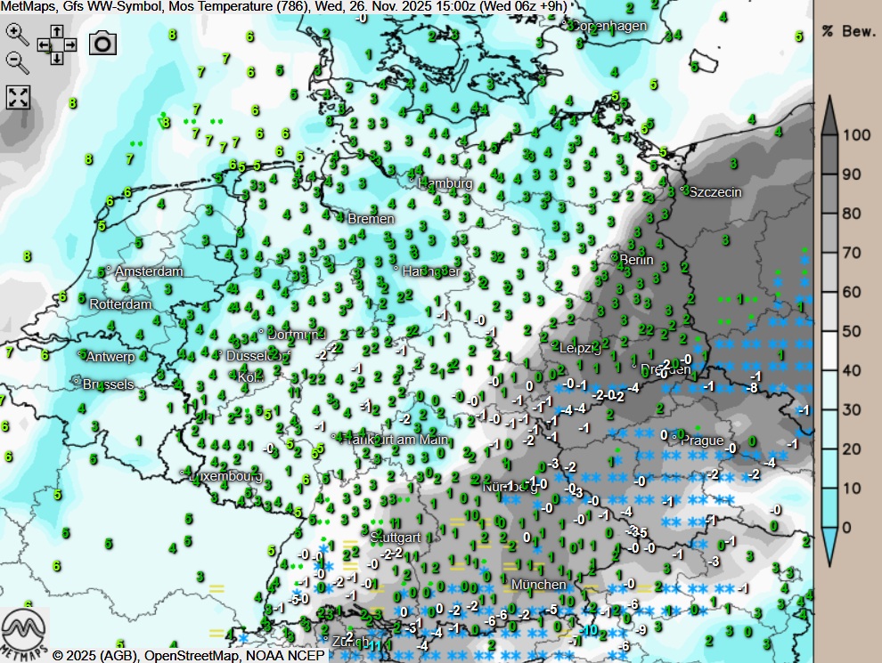 Die Temperatur- und Wetterkarte nach GFS für 15:00 Uhr sowie die Sechs-Stunden-Regenmengen bis 23:00 Uhr: