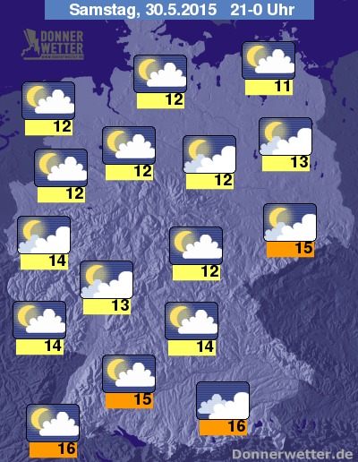 In der Nacht zum Sonntag ist es am Himmel zum Großteil nur locker bewölkt, hier und da können aber auch mal etwas dichtere Wolken durchziehen, dazu bleibt es aber trocken. Die Temperatur sinkt auf 9 Grad im nördlichen Emsland und bis 4 Grad am Taunus.