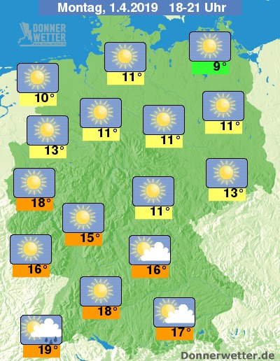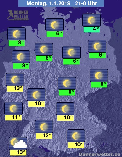 Die Temperaturen sinken bis zum späten Abend auf Werte um 4 Grad C an der Ostseeküste und um 13 Grad C im Rheinland.