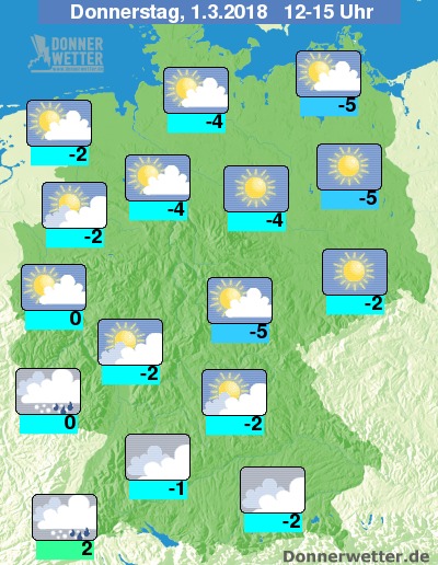 Nach einem frostigen Start in den Tag mit teils zweistelligen Minusgraden steigt das Thermometer im Tagesverlauf merklich an. Dabei wird es vielerorts einige Grad wärmer als an den vorangegangenen Tagen. Während der Nordosten bei Höchstwerten um die -5 Grad nach wie vor bibbert, klettert das Thermometer im Südwesten bereits wieder über die Nullgradgrenze und erreicht am Oberrhein bis zu +4 Grad.