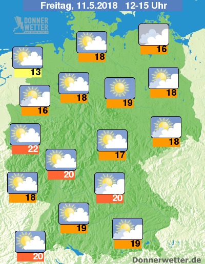 Zudem wird es nach der Abkühlung am Vatertag nun auch im Westen wieder etwas wärmer. Verbreitet liegen die Höchsttemperaturen bei Werten um die 20 Grad, am Rhein sind bereits wieder bis zu 23 Grad möglich. Deutlich kühler bleibt es nur an den Küsten mit maximal 14 bis 16 Grad.