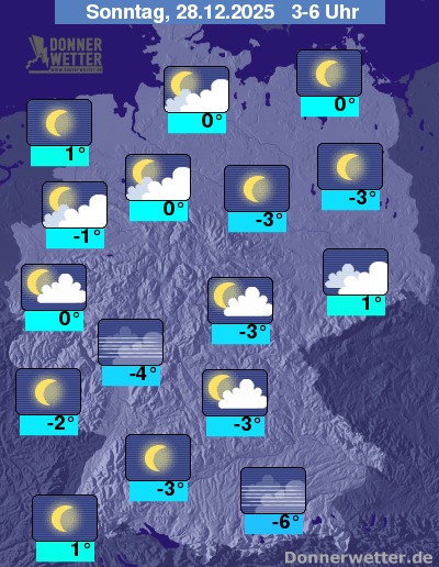 In der Nacht zum Sonntag halten sich vor allem über der Landesmitte, anfangs auch im Norden noch einige, zum Teil auch dichte Wolken. Sonst ist der Himmel jedoch überwiegend nur locker bewölkt oder sternenklar. Es bleibt landesweit trocken bei Tiefstwerten von 1 Grad an der Nordsee und bis -6 Grad im Raum München.