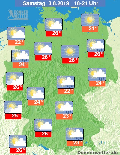Heute Abend ist es im Norden und Westen oft heiter bis sonnig, gebietsweise ziehen hier aber auch einige, teils dichte Wolken durch, dabei bleiben Schauer eher selten. Im übrigen Land ist es häufig stark, zum Teil locker bewölkt, dazu bilden sich gebietsweise Schauer und auch einzelne Gewitter. Die Temperatur liegt noch bei 22 Grad in Wilhelmshaven und bis 26 Grad entlang des Rhein.