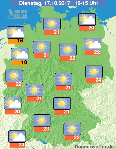Heute Abend ist es über der Nordhälfte der Republik weitgehend nur sonnig, weiter nach Süden hin ziehen auch häufiger lockere Wolkenfelder durch, dabei bleibt es trocken. Die Temperatur liegt bei 17 Grad in Emden und bis 25 Grad in Dresden.