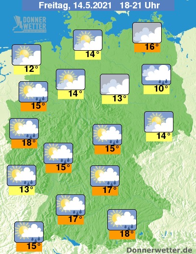Heute Abend hält sich im Nordosten weiterhin dichte Bewölkung und hier fällt gebietsweise Regen, sonst ist es teils heiter, teils ziehen auch kompakte Wolken durch, dazu sind vereinzelte Schauer, örtlich auch Gewitter möglich. Die Temperatur liegt bei teils nur 10 Grad an der Oder und bis 18 Grad in Oberbayern.
