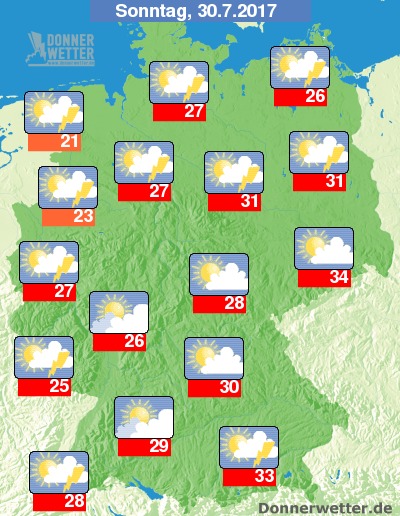 Am Sonntag erwartet uns ein oft freundlicher Sommertag, jedoch bilden sich bei zunehmend dichten Quellwolken bevorzugt im Norden und Westen Deutschlands, jedoch auch am Alpenrand gebietsweise Schauer und auch mögliche, teils kräftige Gewitter. Im Süden und Osten der Republik bleibt es bei eher lockerer Bewölkung größtenteils trocken. Die Temperatur steigt auf 21 Grad an der Nordsee und auf heiße 34 Grad in der Lausitz.