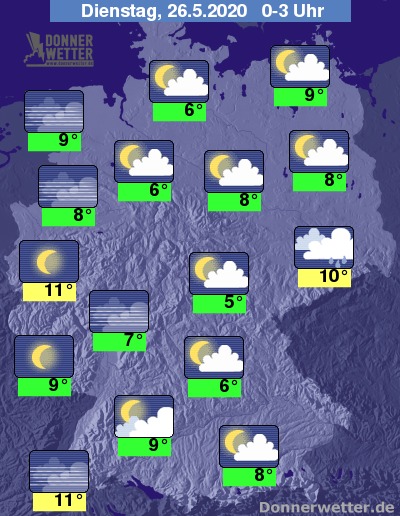 In der Nacht auf Dienstag ist der Himmel meist locker oder aufgelockert bewölkt, in der Westhälfte sowie im äußersten Nordosten kann sich im Verlauf auch stellenweise Nebel bilden. Bis auf einzelne Schauer im Südosten Deutschlands bleibt es in der Nacht trocken.