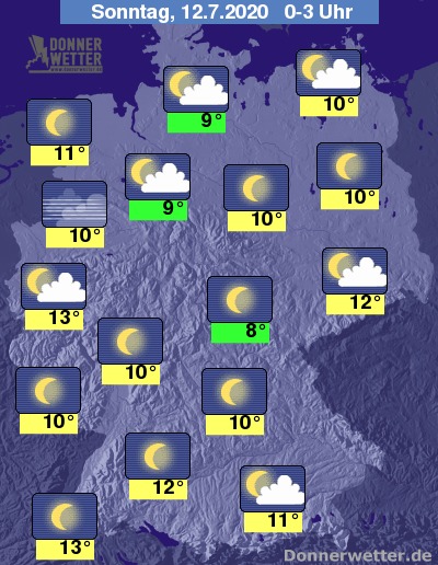 Die Temperaturen sinken in der Nacht auf Werte um 12 Grad in der Kölner Bucht und um 7 Grad in Oberfranken.