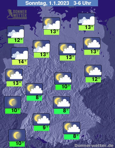 In der Nacht zum Sonntag zeigt sich der Himmel über der Südhälfte der Republik verbreitet nur locker bewölkt oder sternenklar. Weiter nach Norden hin ist es zunehmend bewölkt und oft auch bedeckt. Es bleibt weitgehend trocken bei Tiefstwerten von 14 Grad in Münster und 8 Grad in Augsburg. Über der Nordhälfte weht ein oft starker bis stürmischer Wind. An den See herrscht Sturm.