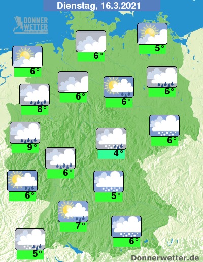 Am Dienstag bleibt der Himmel über weiten Landesteilen start bewölkt oder es ist bedeckt, Auflockerungen sind im Tagesverlauf vor allem in Küstennähe sowie Teilen des Südwestens möglich. Während es im hohen Norden am Dienstag überwiegend trocken bleibt, muss in den übrigen Landesteilen immer wieder mit Schauern gerechnet werden, in den Mittelgebirgen ist auch Schneeregen möglich, in höheren Lagane und an den Alpen fällt durchgängig Schnee. Dabei weht ein mäßiger, im Bergland auch böiger Wind aus West/Nordwest.