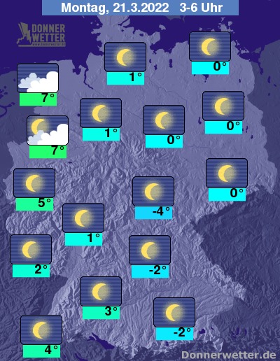 In der Nacht zum Montag sind anfangs in den westlichen Landesteilen zum Teil noch dichte Wolken möglich, dazu bleibt es weitgehend trocken. Im übrigen Land ist es verbreitet sternenklar, dazu bleibt es trocken. Die Temperatur sinkt auf 7 Grad im Emsland und bis -4 Grad im Vogtland.
