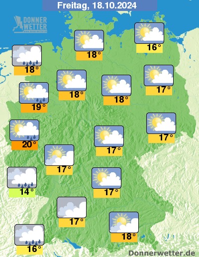 Am Freitag ist es vom Südwesten, über den Westen bis zur Nordsee oft bedeckt und es bilden sich gebietsweise Schauer. Weiter nach Osten hin zeigt sich das Wetter meist heiter bis aufgelockert bewölkt, dabei bleibt es trocken. Die Temperatur erreicht 14 Grad im Saargau und bis 20 Grad im Rheinland.