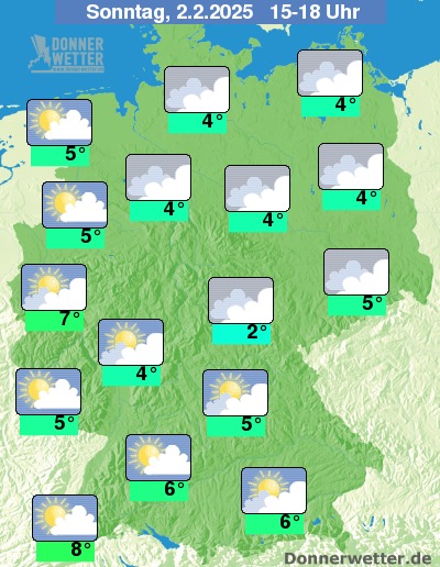 Am Sonntagnachmittag zeigt sich der Himmel über dem Süden und Westen Deutschlands heiter bis wolkig; im Norden und Nordosten sowie in den Niederungen Süddeutschlands bleibt es über den Nachmittag stark bewölkt oder es neblig-trüb, es bleibt aber meist trocken.