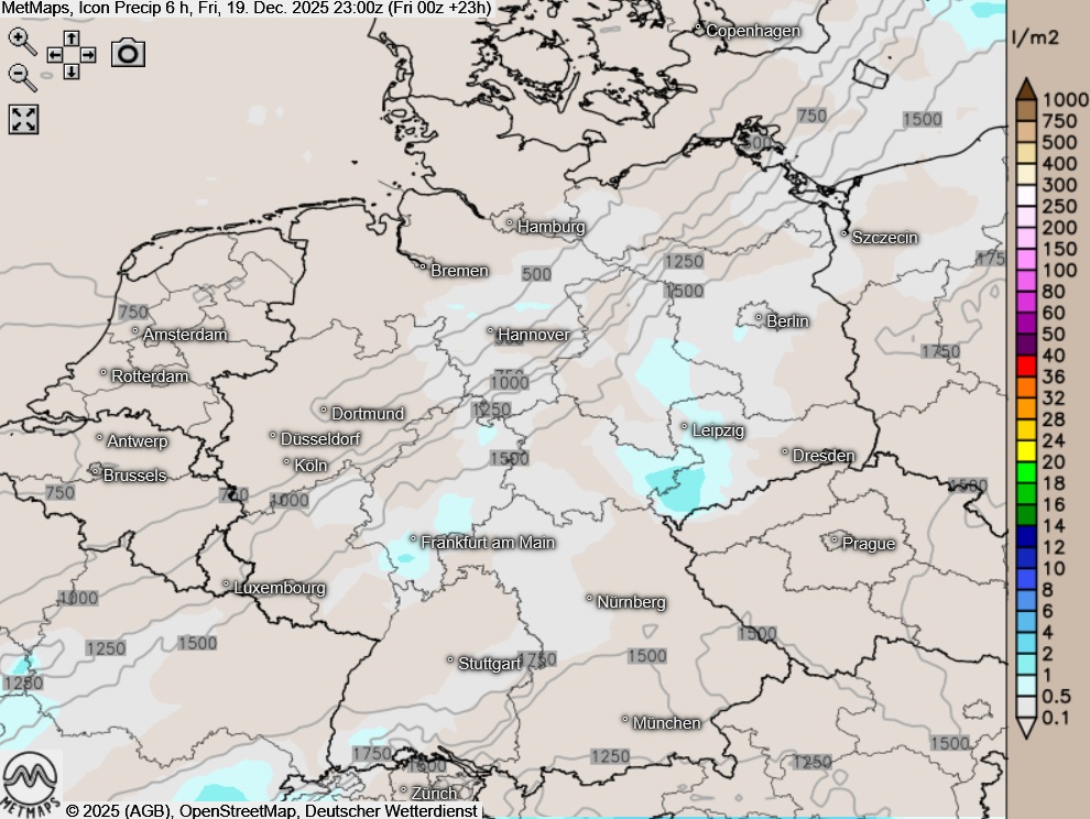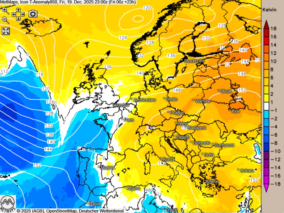 Die Wetter- / Temperaturkarte für Freitagnachmittag, die Sechs-Stunden-Regenmengen bis 23:00 Uhr sowie die Temperaturabweichung in Europa am Freitagnachmittag nach ICON:
