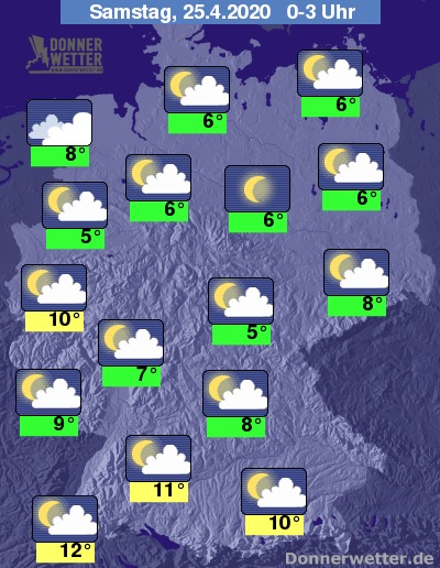 Nach Mitternacht zeigt sich der Himmel zunächst noch verbreitet locker bewölkt. In den frühen Morgenstunden nimmt die Bewölkung über dem norddeutschen Tiefland zu, weiter südlich dominieren weiterhin lockere Wolken, teils ist es auch sternenklar. Es bleibt trocken.