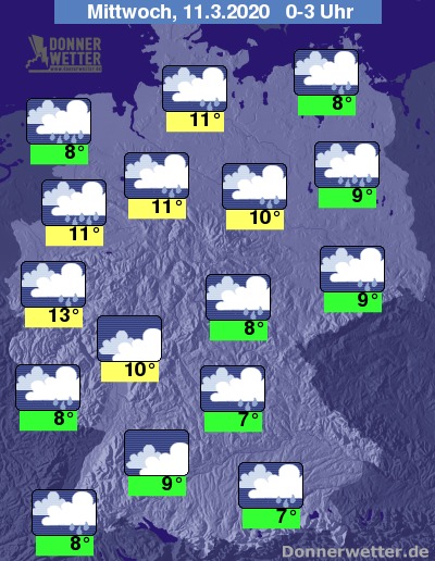 In der Nacht auf Mittwoch bleibt der Himmel über weiten Teilen des Landes bedeckt, dabei fällt verbreitet Regen. Längere trockene Abschnitte stellen sich in den frühen Morgenstunden regional in der Östhälfte sowie südlich der Donau ein. Der Wind frischt mit Durchzug der Kaltfront etwas auf und weht frisch bis stürmisch aus West, vor allem in der Mitte und im Norden Deutschlands.