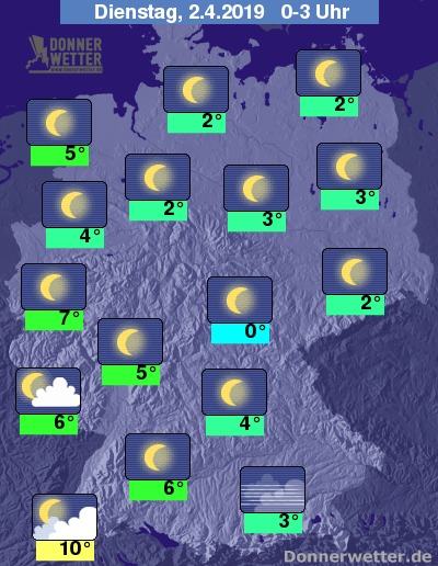 In den Nachtstunden bleibt der Himmel über dem Norden und Osten Deutschlands überwiegend sternenklar, im Süden und Westen nimmt die Bewölkung in den nächste Stunden zu; Schauer sind aber nicht zu erwarten.