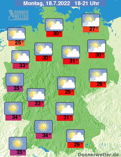 Heute Abend ist es nach Süden und Südwesten hin weitgehend sonnig. Im Osten und Nordosten ziehen lockere bis aufgelockerte Wolken durch, während es im übrigen Land heiter bis sonnig ist. Bei Werten von 25 Grad in Cuxhaven und bis 35 Grad in Köln bleibt es überall trocken.