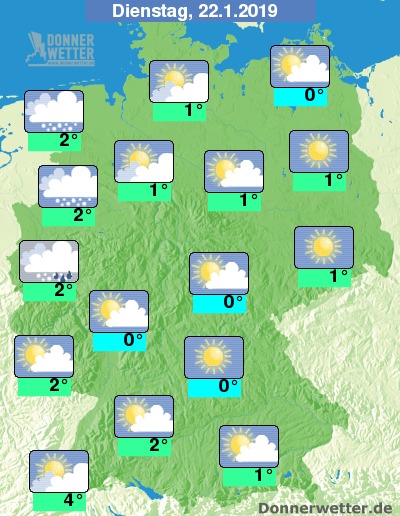 Nach frostiger Nacht gibt es im größten Teil Deutschlands eine freundliche Mischung aus Sonne und lockeren Wolkenfeldern. Teilweise scheint die Sonne auch für längere Zeit. Im Laufe des Nachmittags trübt sich der Himmel im Westen allmählich ein und dort wo Benelux nahe ist beginnt es im weiteren Verlauf leicht bis mäßig zu schneien. Dieses Schneefallband dehnt sich zum späten Abend noch etwas weiter in die westlichen Gebiete aus. In diesen Bereichen muss mit Glätte auf Straßen und Gehwegen gerechnet werden. In den Ballungsgebieten des Westens fällt zunächst auch Schneeregen.