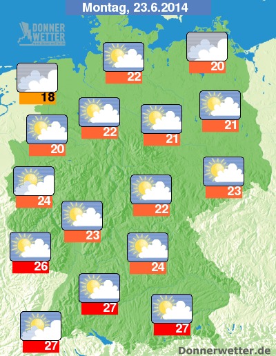 Am Montag erwartet uns vielfach freundliches und trockenes Wetter. Im Norden und im äußeren Süden ziehen dabei auch häufig mehr Wolken durch, wobei es am Alpenrand zu möglichen Schauern und Gewittern kommen kann, sonst bleibt es aber trocken. Die Temperatur steigt auf 18 Grad an der Nordsee und auf rund 27 Grad in Stuttgart und München.