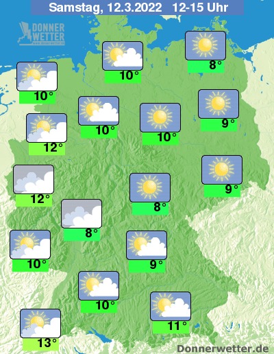 Die Temperaturen erreichen Werte um 9 Grad in der Lausitz, 11 Grad im Saarland und 13 Grad im Breisgau.