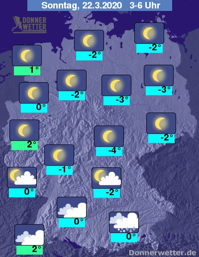 In der kommenden Nacht fällt im Alpenvorland zunächst noch weiterhin Schnee oder Schneeregen, auch sonst ist es über dem Süden noch gebietsweise stark, von Norden her jedoch mehr und mehr aufgelockert bewölkt. Im restlichen Bundesgebiet zeigt sich der Himmel sternenklar, dazu bleibt es trocken. Die Temperatur sinkt auf 2 Grad im Breisgau und bis auf etwa -4 Grad im Vogtland.