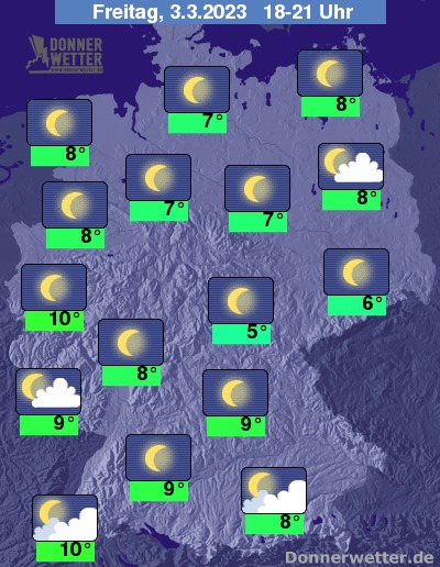In der Nacht zum Samstag zieht sich der Himmel über dem Norden Deutschlands oft zu oder es ist noch aufgelockert bewölkt, dazu bleibt es weitgehend trocken. Im übrigen Bundesgebiet ist es verbreitet sternenklar, an den Alpen auch zum Teil stärker bewölkt, jedoch trocken. Die Temperatur sinkt auf 4 Grad in Cuxhaven und -3 Grad in Jena.