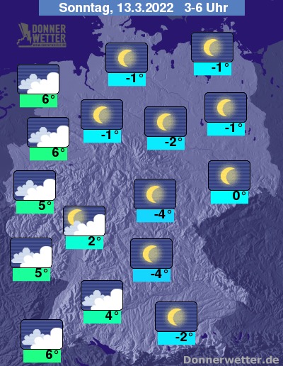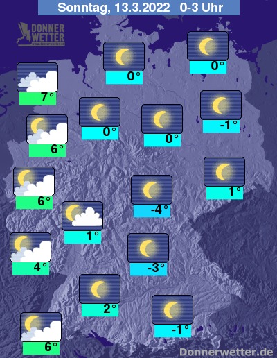 In der Nacht auf Sonntag verdichten sich die Wolken entlang des Rheins, so dass es in den frühen Morgenstunden hier zumeist bedeckt ist. Bei Tiefstwerten um 6 bis 4 Grad bleibt es frostfrei. Östlich bleibt es zumeist sternenklar bei Tiefstwerten um -4 bis 0 Grad.