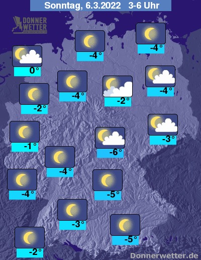 In der Nacht auf Sonntag zeigt sich der Himmel über dem Süden und Westen des Landes meist sternenklar, sonst ist es teils locker, teils aufgelockert bewölkt. Es bleibt trocken.