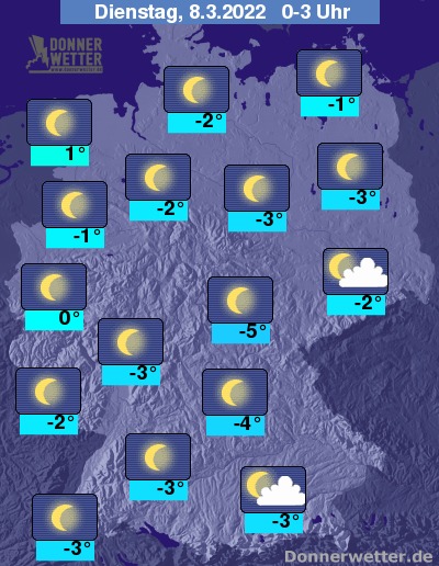 Der Dienstag startet verbreitet heiter oder die Sonne scheint von einem wolkenlosen Himmel. Es bleibt trocken. Die Temperaturen erreichen in den Frühstunden frostige -6 bis 0 Grad.