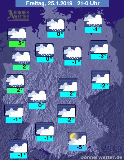 Am Abend zeigen sich gebietsweise noch Mond und Sterne. Der Niederschlag im Westen breitet sich allmählich nach Osten aus. Dabei fällt zunächst verbreitet Schnee, später geht dieser jedoch unter Zufuhr milderer Luft immer mehr in Regen und Sprühregen über. Achtung, auf dem noch gefrorenen Boden musst teilweise mit extremer Glätte durch Schnee, Schneematsch oder Glatteis gerechnet werden.