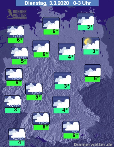 In der Nacht auf Dienstag ist der Himmel überwiegend stark bewölkt oder bedeckt, dabei fällt zunächst vor allem im Westen, in den frühen Morgenstunden dann besonders im Süden des Landes teils kräftiger Regen. In höheren Lagen auch mit Schneeregen oder Schnee durchmischt. Weitgehend trocken bleibt es in den kommenden Stunden meist nur im äußersten Nordosten.