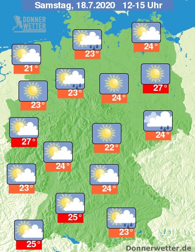 Heute Nachmittag können sich im Nordwesten und Südosten des Landes, sowie über Sachsen unter teils dichten Wolken Schauer bilden. Im übrigen Land ist es oft heiter bis sonnig, teils auch mal wolkiger, aber weitgehend trocken. Die Temperatur liegt bei 21 Grad an der Nordsee und bis 27 Grad im Rheinland.