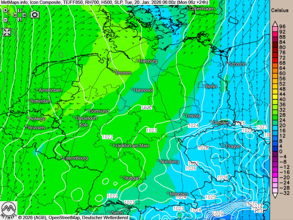 Die Wetter- / Temperatur- sowie die Strömungskarte für Dienstagfrüh (06:00 Uhr) nach ICON: