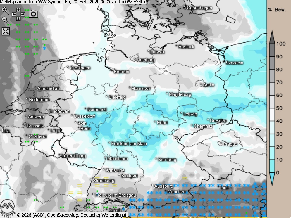 Die Wetter- und Temperaturkarte für Freitagfrüh (06:00 Uhr) sowie die 24-Stunden-Schneemengen am Freitag nach ICON: