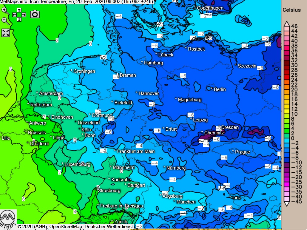Die Temperaturen erreichen im Nordosten Höchstwerte um 0 Grad, die höchsten Temperaturen werden mit 7 Grad entlang des Rheins erreicht.