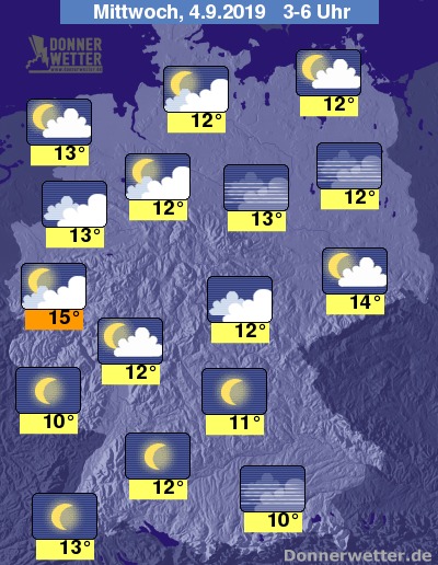 In den Nachtstunden zeigt sich der Himmel über weiten Landesteilen zunächst locker, im weiteren Verlauf auch regional stärker bewölkt; Schauer sind meist aber nicht zu erwarten. Südlich des Mains funkeln die Sternen dagegen von einem überwiegend wolkenlosen Himmel, an den Alpen kann sich zeitweise Nebel bilden.