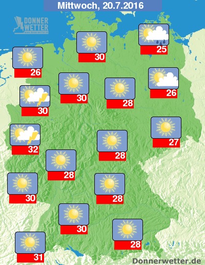 Heute ist es im Land verbreitet sonnig bei nur seltenen harmlosen Wolken. Erst ab dem Nachmittag sind im Westen gebietsweise Schauer und örtliche Gewitter möglich. Vereinzelne Schauer können sich auch im Ostseeumfeld bilden. Im übrigen Land bleibt es trocken bei Höchstwerten von 25 Grad in Rostock und 32 Grad in der Kölner Bucht.