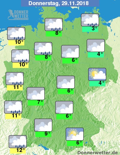 Ganz im Westen, sowie im Nordwesten halten sich tagsüber kompakte Schichtwolken aus denen zeitweise Regen oder Sprühregen fällt. Im übrigen Land dominieren zwar auch die Wolken, doch bleibt es allgemein trocken. In Bayern und Sachsen gibt es wahrscheinlich auch einige freundliche Phasen mit Sonne.