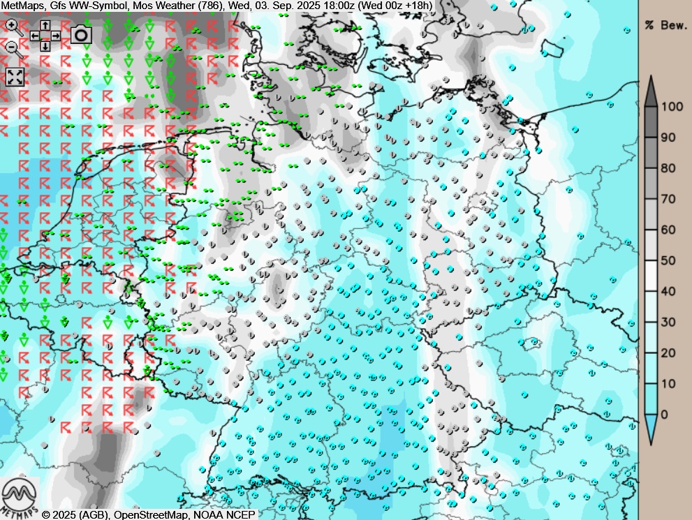 Am Mittwochnachmittag zeigt sich der Himmel über dem Westen und Nordwesten wechselnd oder stark bewölkt, dabei kann zeitweise etwas Regen fallen, abends Übergang in Schauer und Gewitter. Im Nordwesten weht zudem ein starker bis stürmischer Wind. Im Süden und Osten wechseln sich Sonne und Wolken ab und es bleibt überwiegend niederschlagsfrei.